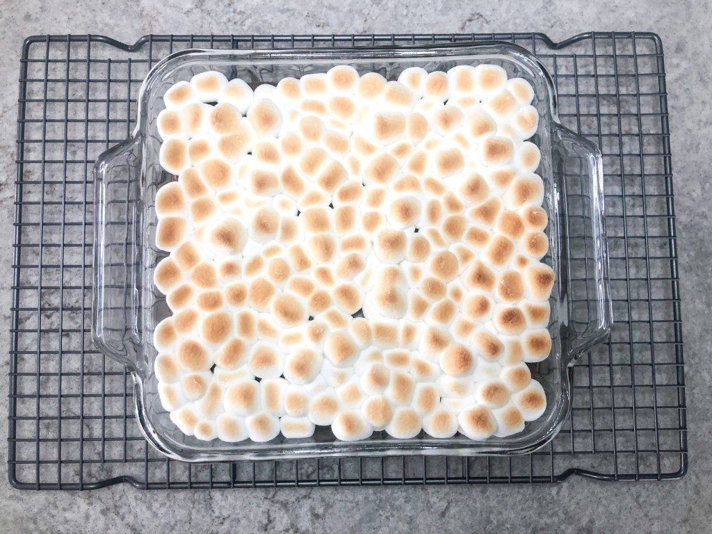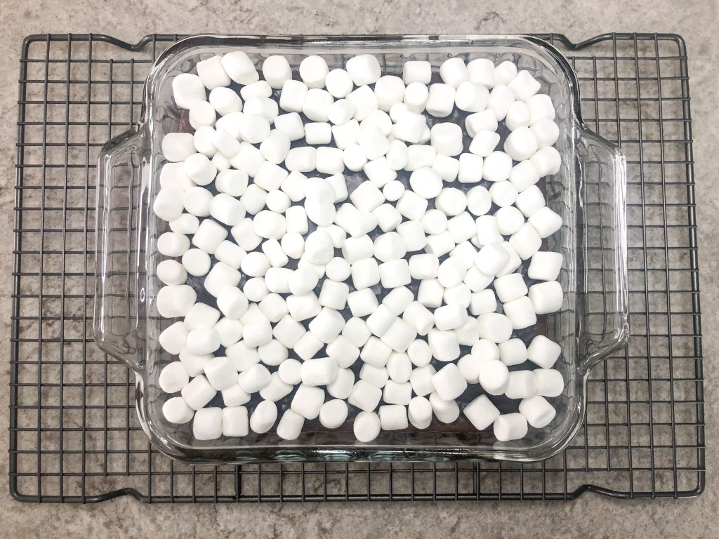 - Once toothpick comes out clean (or almost clean in my house), sprinkle with mini marshmallows. I didn’t measure this but I used just enough to barely cover the brownie, as they will expand in the heat.