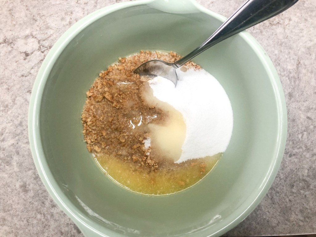 - Pour crushed graham crackers in a bowl along with melted butter and granulated sugar.