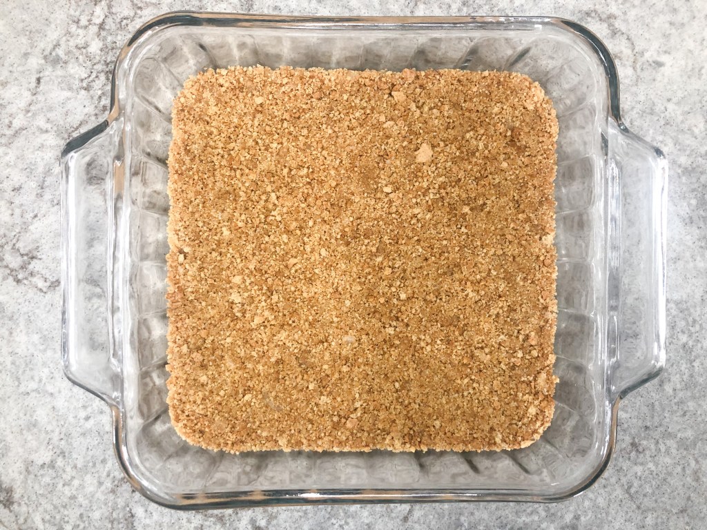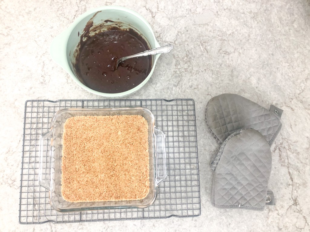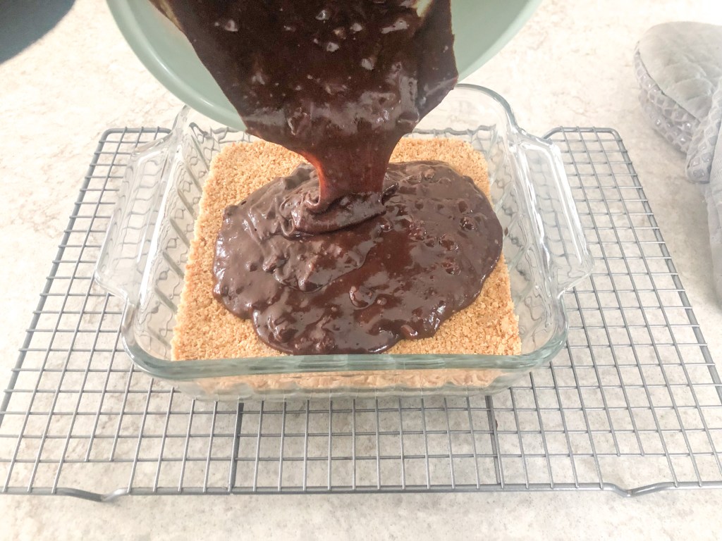 - Pour graham cracker mixture into the bottom of 9×9 baking dish. (I didn’t spray my glass baking dish and luckily didn’t have a problem getting the brownies out, but not a bad idea to spray it)